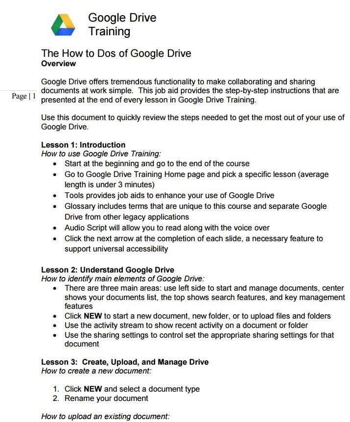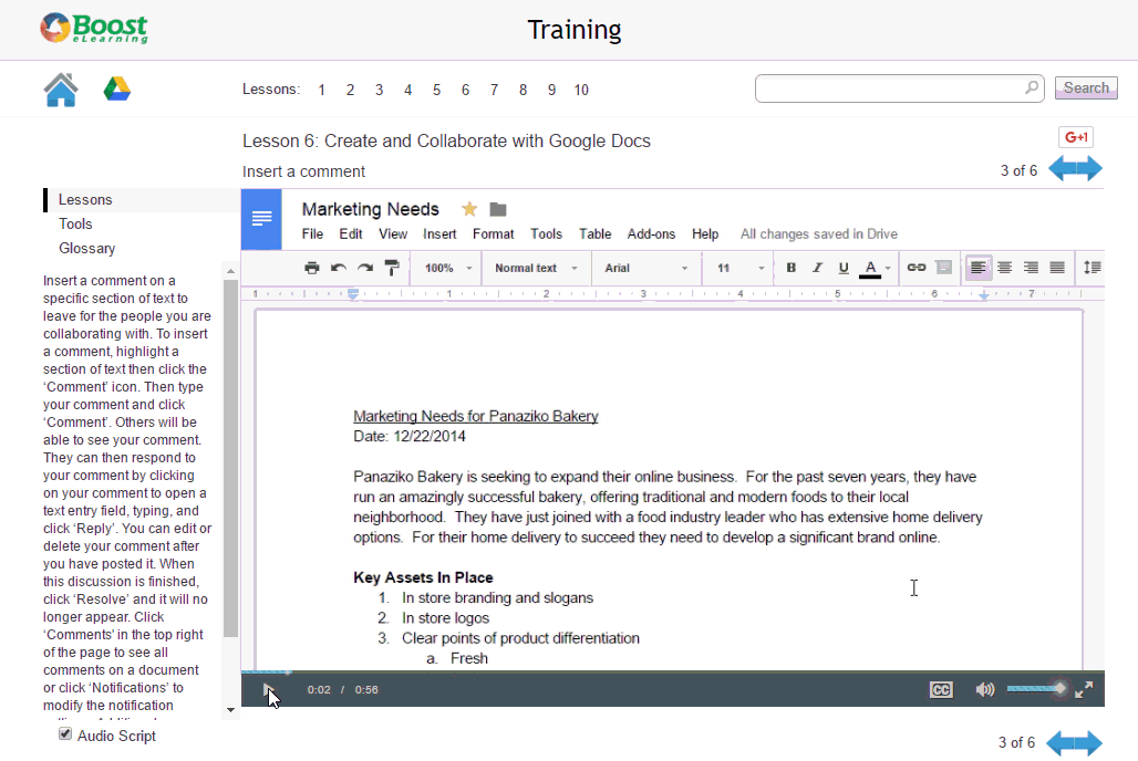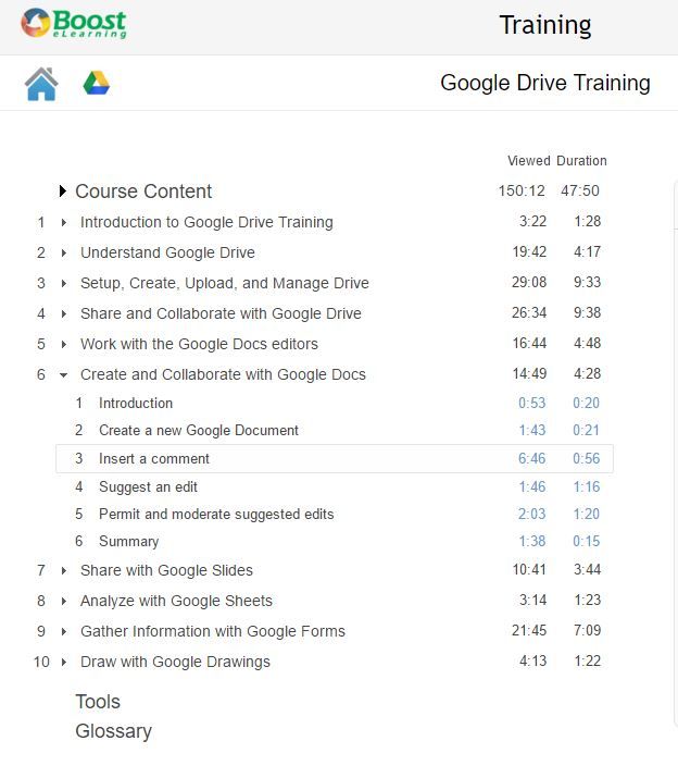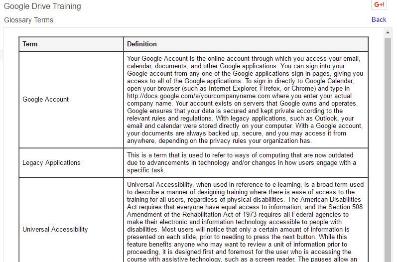Boost eLearning Google Apps Training was built using a combination of step-by-step video recordings (using Camtasia) and support documentation. The courses were comprised of lessons, and lessons were broken up into skills. I ensured the training had bookmarking and a search utility so people could drop in and take the training they needed and get back to work. In addition, each course included extensive documentation to meet the needs of the various learners. Every course included an audio script and was designed to ensure excellent conformance with 508 (c).